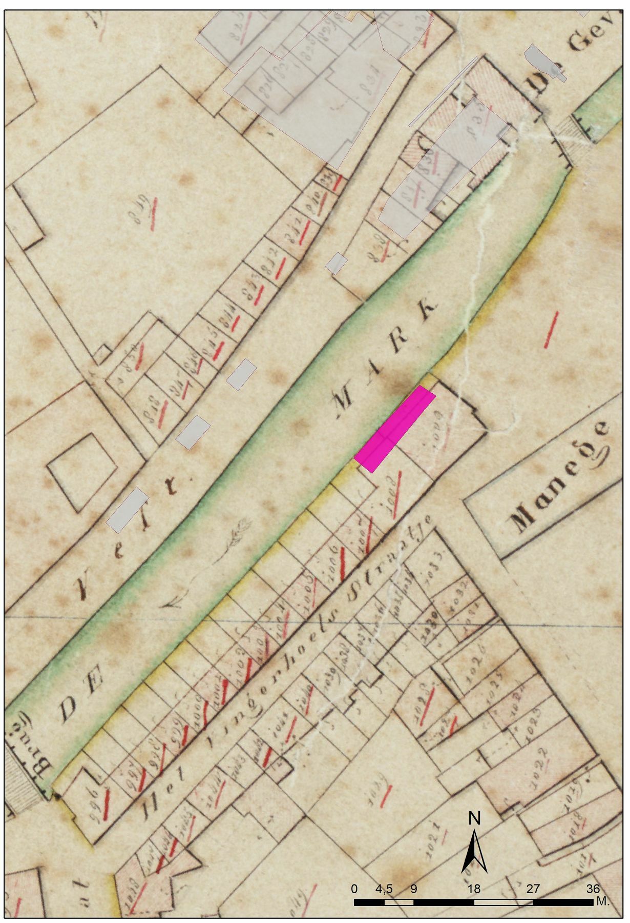 De locatie van de opgravingsputten op het kadastraal minuutplan van 1824 en op de huidige topografie.