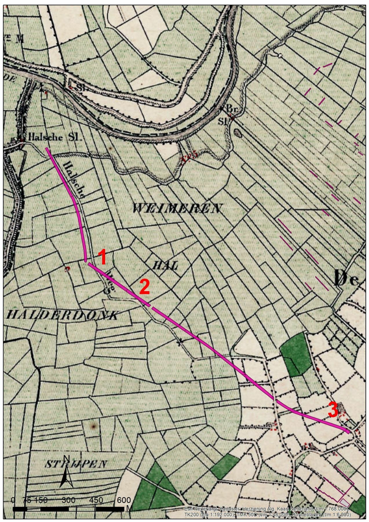Twee vindplaatsen liggen ter hoogte van de Halseweg op twee donken met daartussen veen. De derde vindplaats ligt ter hoogte van de Overveldseweg. Op de topografische kaart van 1870 zijn deze vindplaatsen aangegeven.