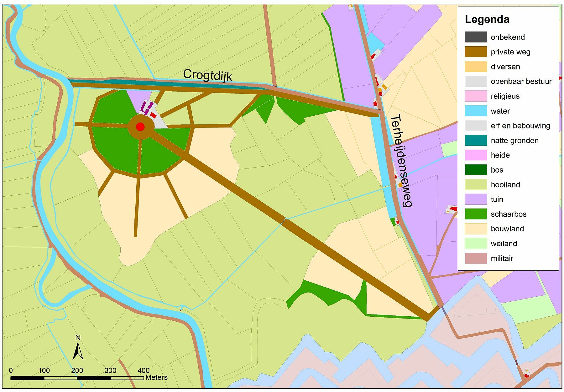 06-01-2026Aan de hand van het grondgebruik valt er veel over het oude landschap te vertellen. Een groot deel van de Belcrumpolder moet een laag en nat gebied geweest zijn. Hooiland, dat te nat te nat en drassig was om er koeien op te laten grazen, en misschien in de winter zelfs onder water kwam te staan. Een groot verschil met het gebied ten oosten van de Terheijdenseweg, het huidige Liniekwartier, met veel tuinbouw, akkers en een flink aantal boerderijen.