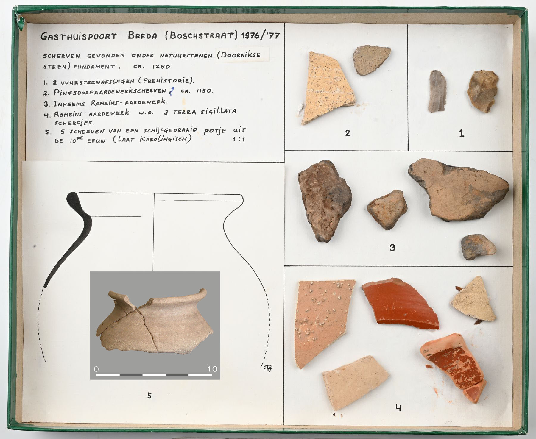 Tijdens de allereerste opgravingen in Breda werd door amateurarcheologen de middeleeuwse Gasthuispoort blootgelegd. Naast het vele muurwerk werden er ook nog een aantal kleine maar bijzondere scherven en werktuigjes gevonden.
