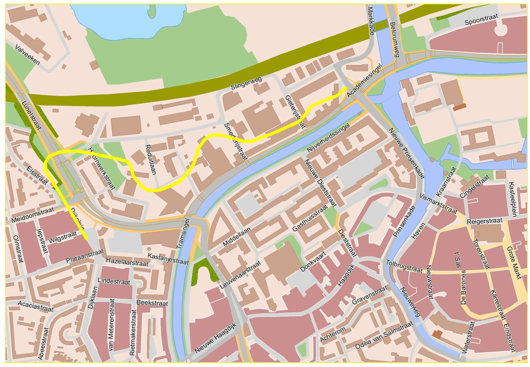De huidige Slingerweg loop dus niet meer over het oude tracé. Maar aan de overkant van de Lunetstraat ligt de Dijklaan, ook een deel van die rondweg, en die nog precies op z'n plek.